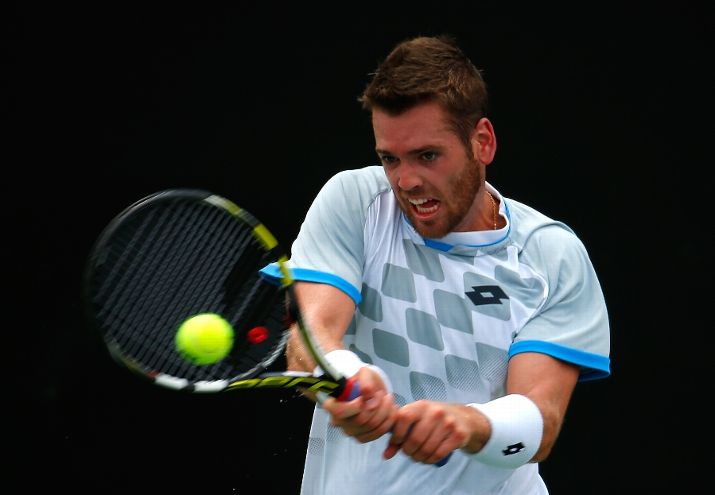 ATLANTA, GA - JULY 28: Austin Krajicek returns a backhand to Marcos Baghdatis of Cyprus during the BB&T Atlanta Open at Atlantic Station on July 28, 2015 in Atlanta, Georgia. (Photo by Kevin C. Cox/Getty Images)