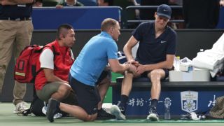 SHANGHAI -- Big-serving Frenchman Giovanni Mpetshi Perricard upset fourth-ranked Taylor Fritz 6-4, 7-5 to advance to the fourth round of the Shanghai Masters on Sunday, while defending champion Jannik Sinner retired due to severe leg cramps. After taking the opening set, Sinner, who won the China Open in Beijing on Wednesday, trailed 6-7 (3), 7-5, 3-2 against Tallon Griekspoor when he abandoned the match in humid conditions. Sinner massaged his right thigh during the decider. "This is definitely not the way you want to win," Griekspoor said. "Brutal conditions here in Shanghai all week already. I thought we were a little bit lucky to play in the evening without sun, but two hours and 36 minutes on the clock, middle of the third set ... I'm sorry for him. I wish him a speedy recovery."  Mpetshi Perricard sent down 12 aces to Fritz's nine and took a break in each set as he clinched his first tour victory against the American to set up a last-16 meeting with 10th-seeded Holger Rune. Also Sunday, Novak Djokovic was made to work hard before he rallied past German qualifier Yannick Hanfmann 4-6, 7-5, 6-3. Djokovic struggled to cope with Hanfmann's big serve and excellent play at the net. He will be up against Jaume Munar in the next round. Djokovic was sick during the second set and threw up during a changeover. "It's the same for every player out on the court, but it's brutal," Djokovic said of the conditions. "It's brutal when you have over 80 percent of humidity day after day, particularly for the guys when they're playing during the day with heat, with sun, it's even more brutal." Djokovic is bidding for a record-extending fifth title at the Shanghai Masters. Rune beat 21st-seeded Ugo Humbert 6-4, 6-4; Zizou Bergs upset 19th-seeded Francisco Cerundolo 7-6 (1), 6-3; and the 31st-seeded Gabriel Diallo advanced by walkover after David Goffin retired early in the first set. Top-ranked Carlos Alcaraz, who won the Japan Open last week, is not in Shanghai due to minor ailments.