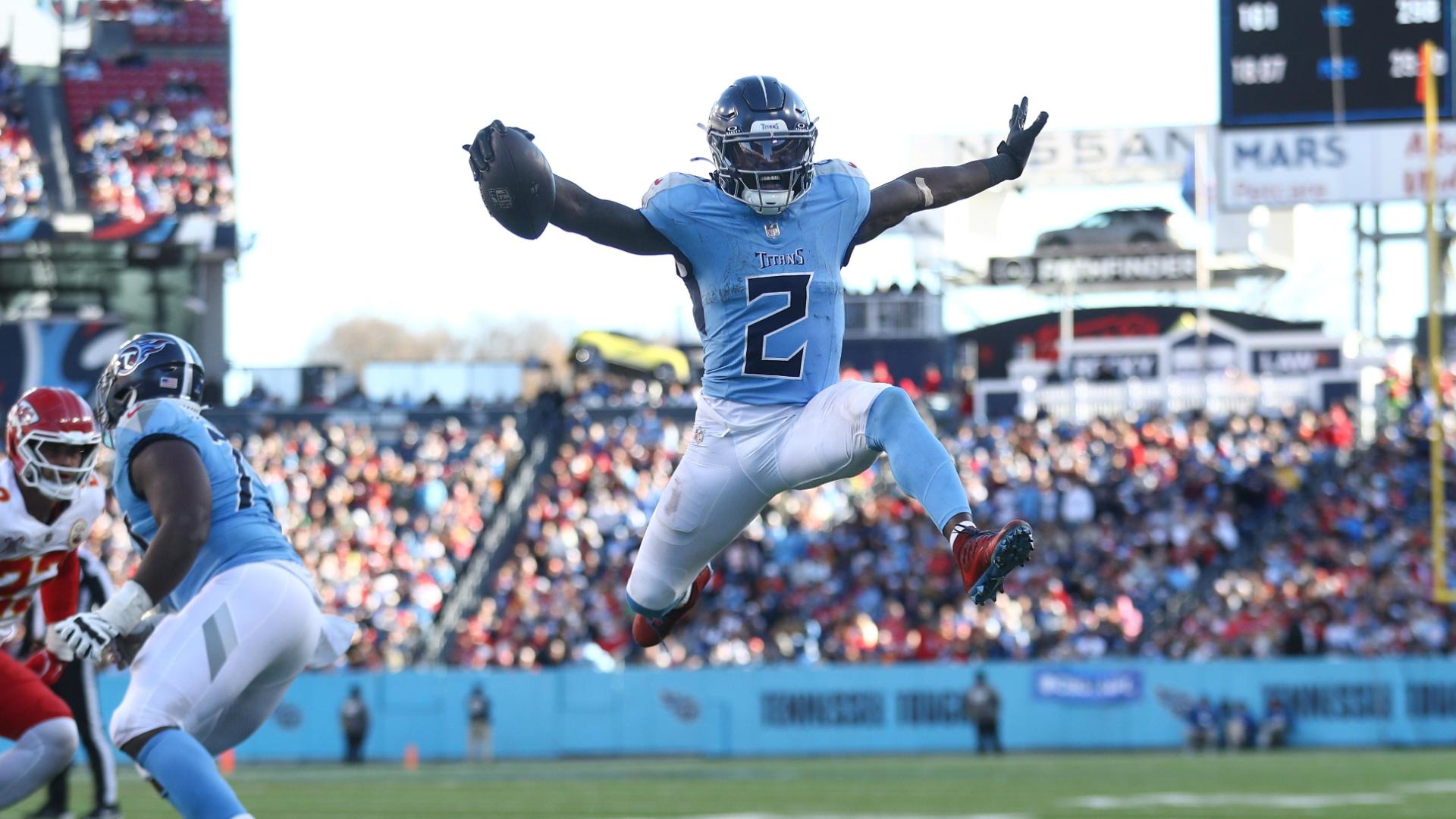 Tyjae Spears leaps into the end zone to increase Titans' lead