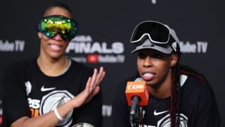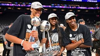 "HOPE Y'ALL ENJOYED THAT!" Gray says as she walks down the hallway toward the Aces' locker room. "See y'all next summer!" Wilson isn't far behind. Clutching the championship trophy, she skips down the hallway before running to the locker room. When the players emerge, they are wearing champagne goggles and reek of beer. Wilson enters the news conference ringing a pink tambourine while Aces owner Davis attempts to answer a serious question. "I need to sit down," Wilson says and finds a spot among the media chairs, still wearing her goggles. The celebration continues. Wilson rings the tambourine, using it as emphatic punctuation for statements from her teammates. She looks bewildered when someone brings up Michael Jordan comparisons. Young quietly holds her oversized bottle of champagne or beer, it isn't clear which, opting not to speak unless spoken to. Except when she's whispering to Wilson behind Gray's back. Gray tries to keep everyone in line. "These three," Hammon says about her star trio, tears welling in her eyes. "I love being their coach. I love being their friend. I love being a phone call for them. I push them probably sometimes to their disliking a little bit, but I'm invested in their greatness." As Hammon speaks, Wilson holds up a towel so she can't look at her coach. But as Hammon continues, Wilson brings the towel down, raises her goggles, and covers her teary eyes. Gray and Young both look away from their teammate and coach in an effort to conceal their own emotion. Gray, Wilson and Young are all free agents after this season. They could go anywhere, but why would they? Individually they are exceptional. Together they are legendary. "Greatness is who you're around," Wilson says. "Like this group."
