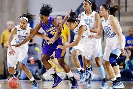 NEWARK, Del. -- Come for the party. Stay for what was nearly a historic upset. The Bob Carpenter Center wasn't as full for the game that followed host Delaware's comeback victory against West Virginia, but those fans who were on hand almost saw something even more rare than Elena Delle Donne. There is one of her, after all. There had never been a win for a No. 14 seed in the NCAA tournament. Trailing most of the game, and down as many as eight points in the second half, third-seeded North Carolina rallied for a 59-54 victory and escaped attaching its name to unwanted history against No. 14 seed Albany. Some thoughts on what was a great escape:  • Ace in the hole: Albany played better together for much, and maybe all, of Sunday's game, but the old adage that it pays to have the best player on the court in the postseason proved true. Tierra Ruffin-Pratt saved the day with 30 points, five assists (out of the nine field goals any other Tar Heels player hit) and five steals in an Alyssa Thomas-like performance. She did everything for her team except make substitutions. So it was a good thing she kept herself in the game. Ruffin-Pratt picked up her second and third fouls on one whistle in the first half, called for a personal foul and then a technical foul when she showed her displeasure with the ruling. She was then whistled for an offensive foul, her fourth, with nearly 10 minutes remaining in the second half but never came off the court. "I just played ball," Ruffin-Pratt said. "The foul trouble sat me out a little bit in the first half, but I just kept playing as hard as I could. It really didn't stop me from being aggressive or anything. I kept driving to the basket, hitting my open teammates, getting to the rim." • Battle of the bigs: North Carolina's Waltiea Rolle isn't all that familiar with meeting posts her own size in the ACC. Like the rest of us, the 6-foot-6 senior definitely isn't used to looking up at players from the America East. And Albany's 6-foot-8 sophomore center Megan Craig, a native of New Zealand, wasn't just a big body. Midway through the second half, she had a plus-15 plus-minus rating (Albany had outscored North Carolina by 12 points with her on the court). No other Albany player was better than plus-four at the time. She finished a team-high plus-seven. But matched against Craig for much of the game, Rolle finished with 14 points, 14 rebounds and eight blocks, the last neutralizing some of the plentiful second chances Albany gave itself. • Rebounding: Speaking of second chances, Albany arrived in Newark ranked seventh in the nation in rebound margin. That put the team one slot ahead of Baylor, but it was difficult to know how much stock to put in the statistic, given the level of competition. Well, put some stock in it. The Great Danes finished with two more rebounds than the Tar Heels and piled up 21 offensive rebounds. It wasn't just because they had a 6-8 kid, either. Craig had a modest six in Sunday's game, while senior Julie Forster had 13 to cap a career in which the program's all-time leading rebounder began as a walk-on on academic scholarship. North Carolina still came up with the two rebounds it really needed in the final minute, Tar Heels twice tipping missed free throws back to teammates when defensive rebounds would have given Albany a chance to tie.  Up for the moment: Maybe it was the familiar feel of a mid-major gym, but Albany never looked uncomfortable in its surroundings. Considering that the only previous game the Great Danes had played this season against a team in the NCAA tournament field was a 67-35 loss at Michigan State around Thanksgiving, that's no small accomplishment. "We deserved to win that game, and I think everybody in the room knows that," Albany coach Katie Abrahamson-Henderson said. "And I think North Carolina knows that, too." • History made: Creighton nearly got No. 14 seeds on the board a season ago, losing at the buzzer against No. 3 St. John's in the first round. But the fact remained that those teams were 0-76 entering this year's tournament. Stetson and Wichita State added two more double-digit point losses to the tally against UCLA and Texas A&M, respectively, on Saturday, but perhaps the gap is closing. Montana pushed UCLA in 2011, East Tennessee State pushed Xavier in 2010, and on and on. At some point, one of these No. 14 seeds will do it for 40 minutes instead of 35. "The thing is you don't know how good they are because they don't get all the attention, the media attention and everything like that," North Carolina coach Sylvia Hatchell said. "You just don't know quite as much about them, I think. And because a lot of them are playing four guards now, you've got more ballhandlers that can handle pressure. Used to be, you could go after people a lot. But they can handle pressure because there's more guards out there. I think that makes a difference."