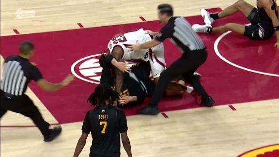 Four players are ejected as Arkansas prevails vs. Winthrop in wild fashion